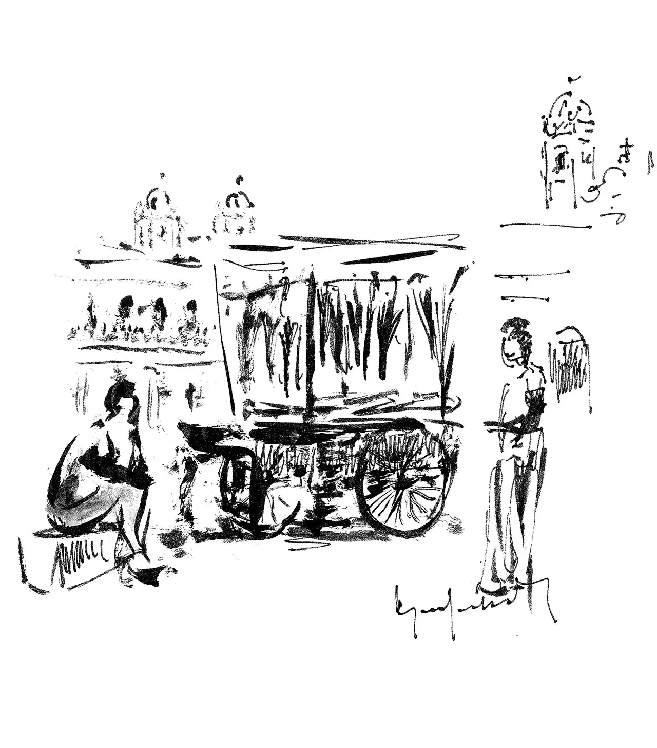 Espalhadas por terra ou sobre frágeis bancas, penduradas nas paredes das igrejas ou oferecidas em tabuleiros suspensos ao pescoço dos camelôs, encontramos ao passear todos os objetos e adornos necessários aos mais diversos fins. Há a rua dos couros, a rua das roupas feitas, a rua das rendas e a das roupas de baixo, o bairro (já ia chamá-lo de souk¹) do ferro velho, o canto das mercearias, e, por toda a parte, balas, perfumes baratos, bugigangas de matéria plástica. Há até (eu vi apenas um) um vendedor de guarda-chuvas de segunda mão!