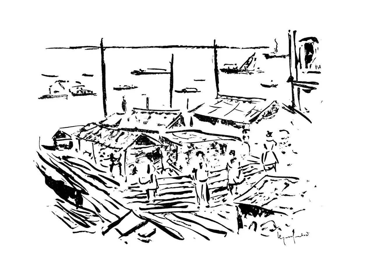 Mas, justa retribuição, já que o rio invade a cidade, os homens constroem sobre as águas, e em toda a parte, encarapitados sobre pilotis ou flutuantes sobre troncos de balsa, humildes choupanas de barro cobertas de folhas de palmeiras, pequenas casas de madeira interligadas às vezes por verdadeiras ruas flutuantes, formam uma cidade lacustre do mais extraordinário aspecto. O próprio mercado flutua sobre a margem do rio, e ao largo, postos de gasolina e de óleo diesel, docas e cais do porto flutuam também sobre a água azeitonada do bem denominado Rio Negro.