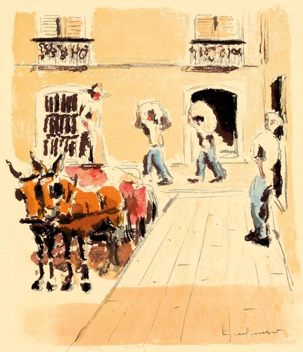 Quando morávamos em Santos, há mais de vinte anos, ainda era em carroças que transportávamos o café, pequenas carroças de duas rodas puxadas por um burro, ou outras de quatro rodas com dupla atrelagem. Assim que um navio chegava ao porto, era uma alegre procissão dessas charretes, pintadas de cores vivas, que, a largos trotes, se dirigiam para os cais, acompanhadas pela fanfarra dos guizos e do estalido dos chicotes que agitavam os condutores, sólidos portugueses bigodudos, cobertos por enormes chapéus de palha e cingidos com aventais de juta. Rédeas na mão, pernas afastadas, eles se mantinham de pé à frente das charretes, eretos e orgulhosos como condutores de bigas romanas.