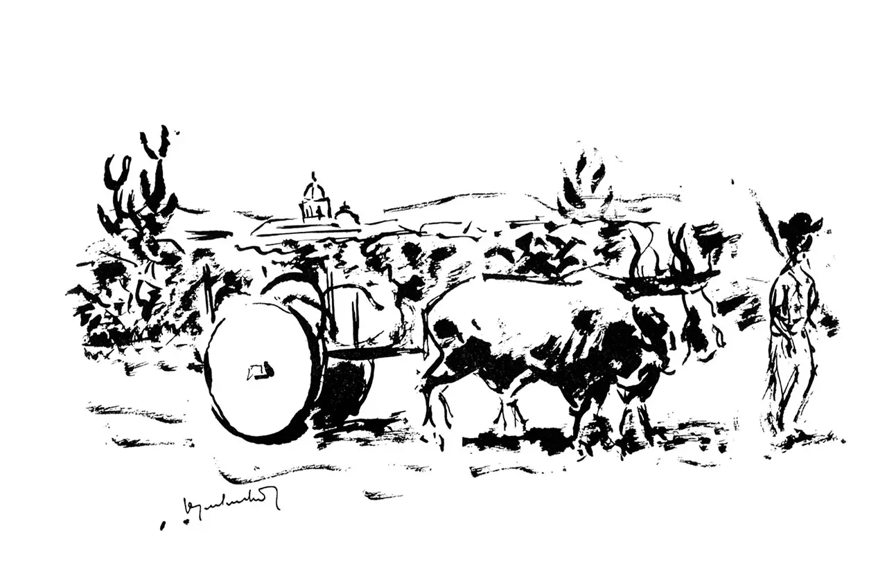 Vemo-los ao longo das estradas e ouvimos o rugido agudo dos carros de boi, de rodas maciças de madeira, pacíficos veículos pesados de um mundo onde o tempo ainda não assumiu um valor essencial.