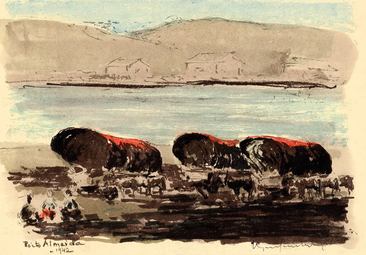 Agora é a hora de descanso para os cocheiros. Acocorados em torno de um fogo de acampamento, eles passam a garrafa de cachaça de mão em mão enquanto esperam que a água comece a ferver. Começam então os ritos do chimarrão, enquanto desfilam lembranças ainda frescas da estada em União da Vitória. Logo, após um lanche frugal de salsichão e pão preto, os “caroceiros“ dormirão sob a lona resinosa de suas carroças, entre sacos de farinha, de açúcar, de sal, de rolos de algodão, de caixas de quinquilharia, carregamento do retorno que substituiu os grãos, os ovos, as caixas de aves, as peles de animal não completamente secas, os rolos de linho bruto que foram descarregados ontem na cidade.